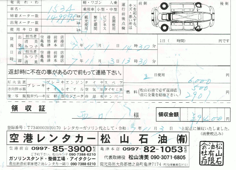 最後に飛行機とレンタカーについて書いておきましょう。 そして↓がレンタカーの貸渡契約書。