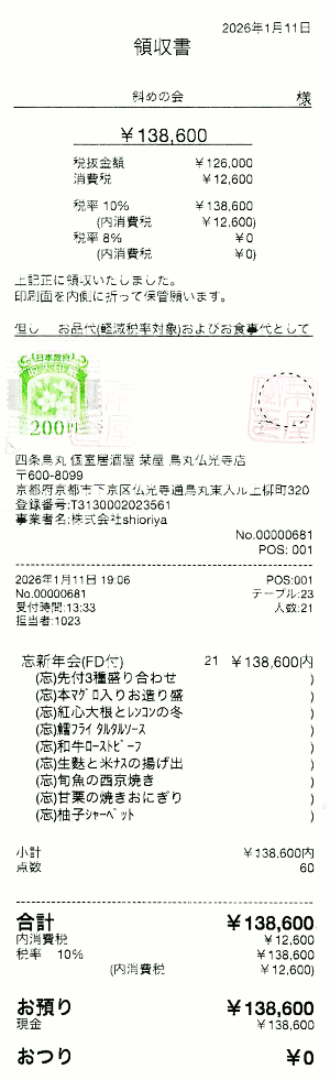 ←は、『120分飲み放題付(L.O.120分) 忘新年会コース、単価 ¥6,600/1名』 の領収証、